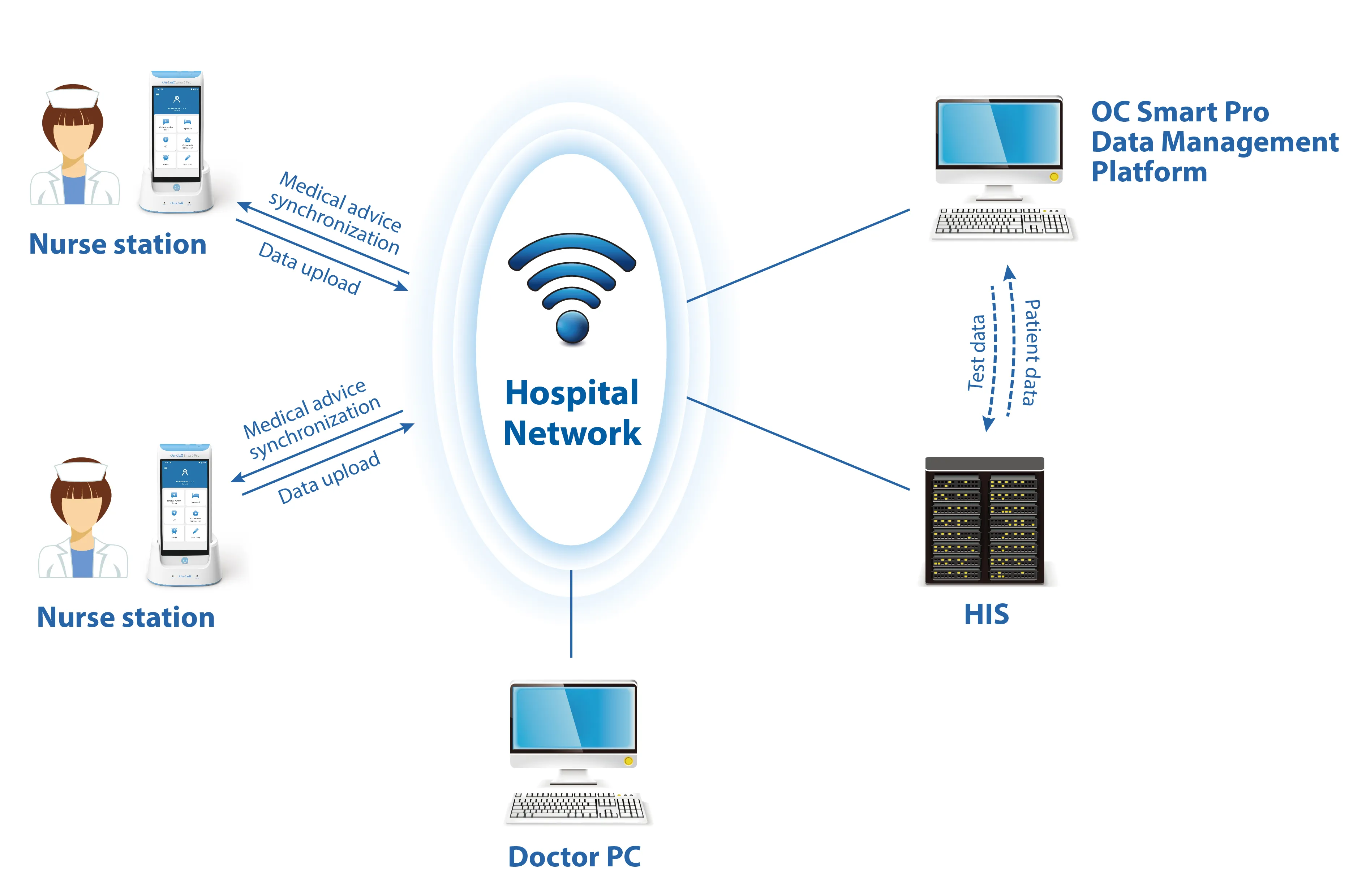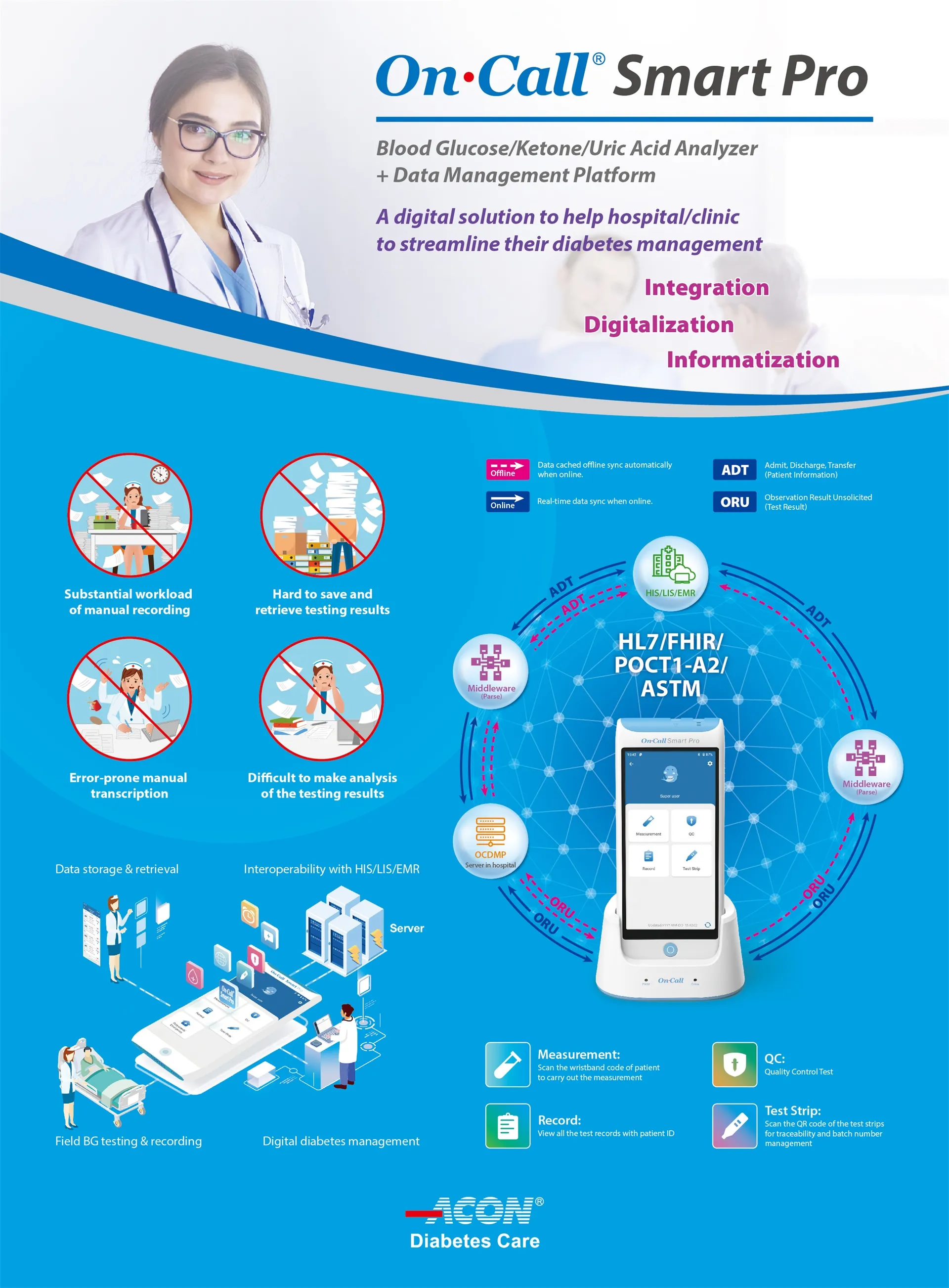 Our On Call Smart Pro diabetes management system can integrate with the HIS (Hospital Information System), LIS (Laboratory Information System), and EMR (Electronic Medical Record) systems to streamline diabetes management, reduce workload, and enable data to be accessed, shared, and/or analyzed securely and appropriately across the complete spectrum of diabetes management.